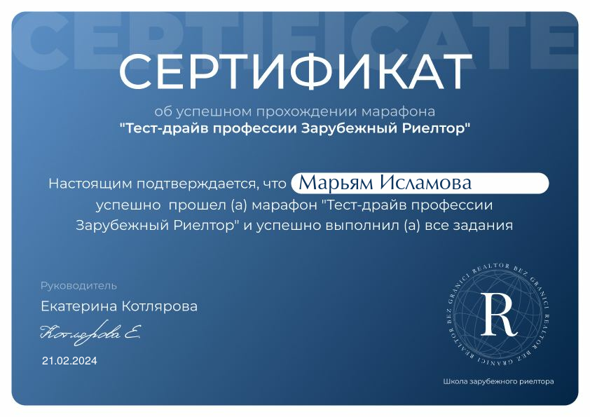 Хочу поблагодарить Исламову Марьям, за выполненную работу. За внимательность,за консультации 24/7,за профессионализм.
