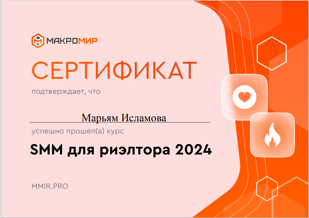 Хочу поблагодарить Марьям за две сделки. Первая - продажа квартиры. А вторая - быстрое одобрение ипотеки и покупка квартиры. При том, что у меня не простая ситуация, много критериев к выбору квартиры и уже имеющаяся ипотека, мы быстро решили всё вопросы и выбрали квартиру. Благодарю и рекомендую!