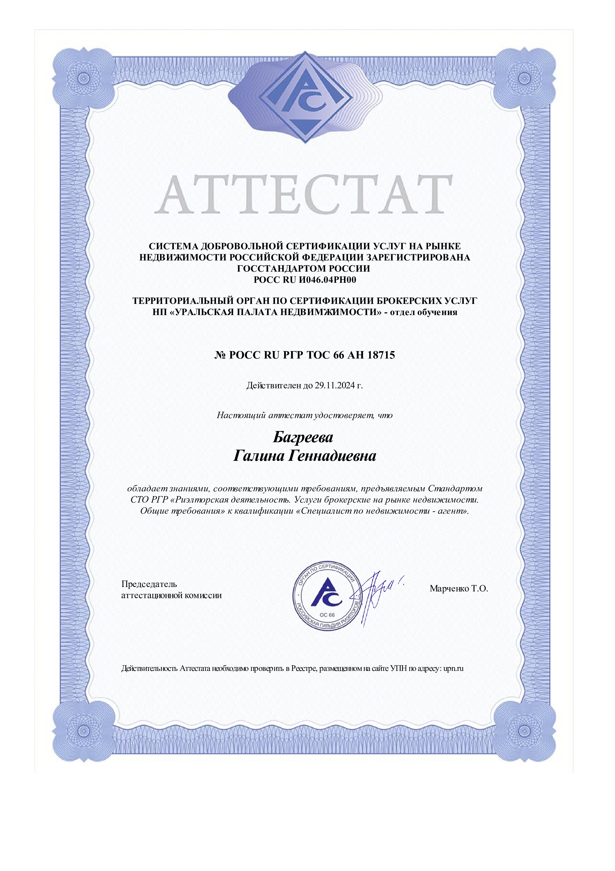 Я Багреева Галина Геннадиевна являюсь специалистом по недвижимости. Помогу с выбором квартиры как на вторичном рынке, так и в новостройке. Продажа или обмен вашей квартиры, в том числе с обременением. Одобрение Ипотеки, страхование, сделки с материнским капиталом.